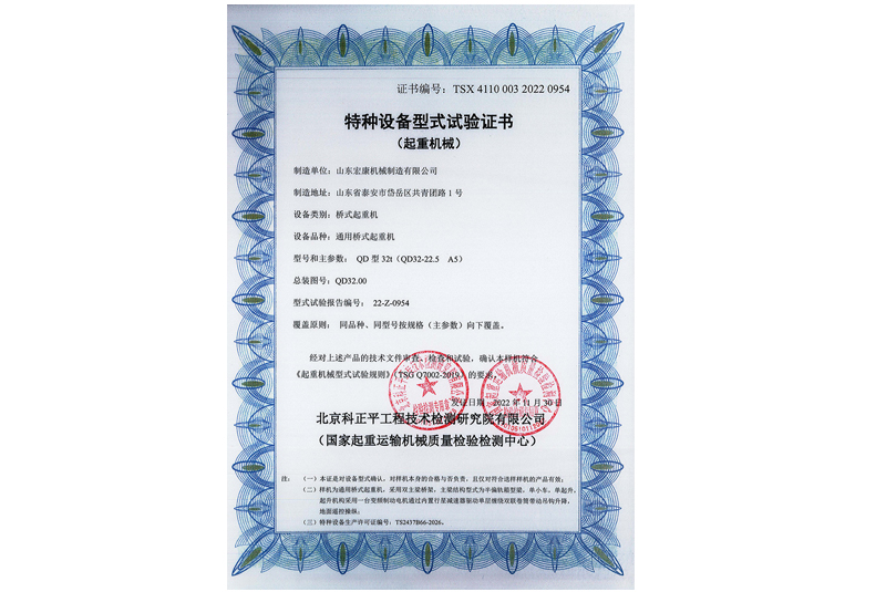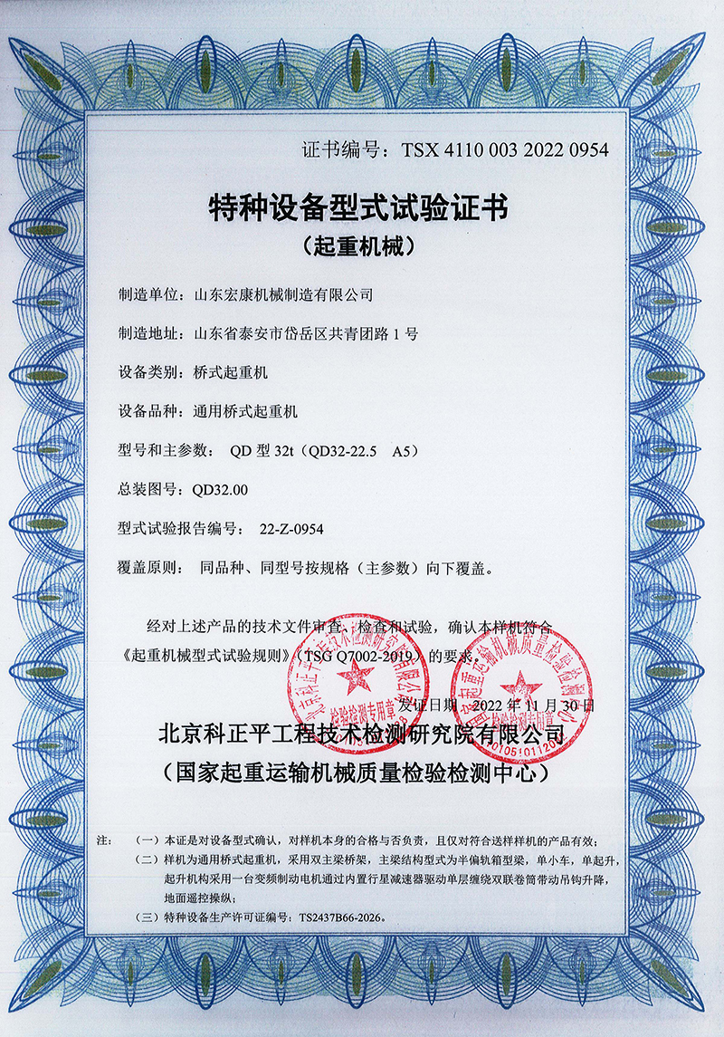 通用橋式起重機(雙梁)型式試驗合格證