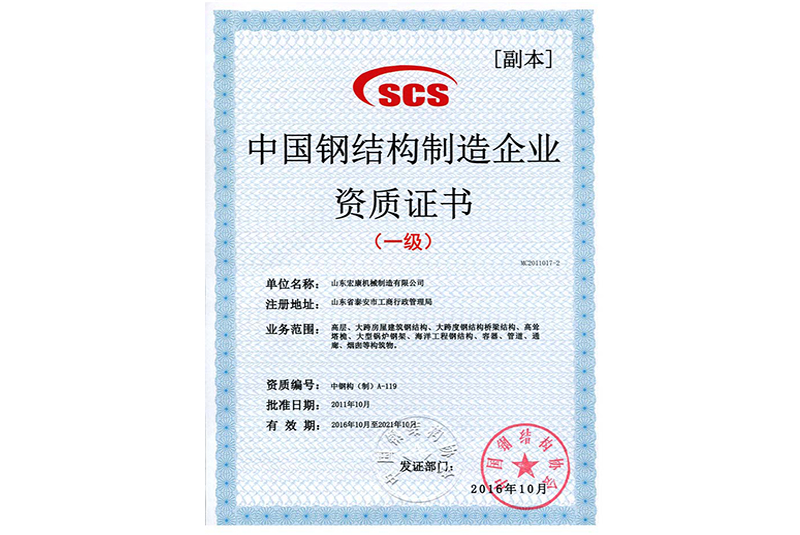 中國鋼結構制造企業資質證書(一級)